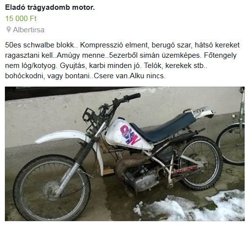 Ugyanitt motor eladó, de csak olyanoknak akiknek írásos igazolást tudnak felmutatni, hogy abs nélkül is meg tudnak állni vele. Nem tudom mennyit megy nyélgázon, mennyit eszik, hol a nyomatékcsúcs és még a könyököm sem ér le a kanyarban (na jó egyszer leért, de arra nem vagyok büszke) szóval nem tudom miafasznak tartsam mikor még biciklivel is agresszívabban közlekedek.