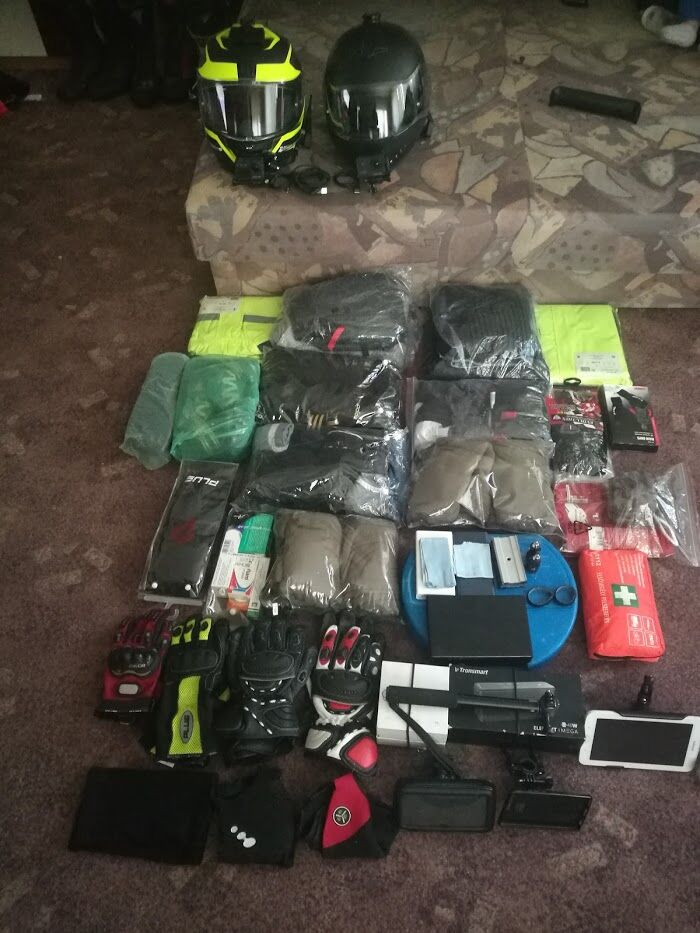 Alsónemű, fürdőruha, zokni, cipő, papucs, aláöltöző, melegítő alsó felső, póló, esőruha-csizmára kesztyűre is, Kamerához kiegészítők, telefonhoz töltő, kábelek, 220v-os átalakító, powebank, sima- vízálló telefontartó, 1TB-os HDD a 2 kameráról nap végén lementeni a videókat, szerszámkészlet, elsősegély doboz, izzókészlet, defekt javító, kuplung és gázbowden 2 motorhoz, láncolajozó, 2 db láthatósági mellény, motor zár. -