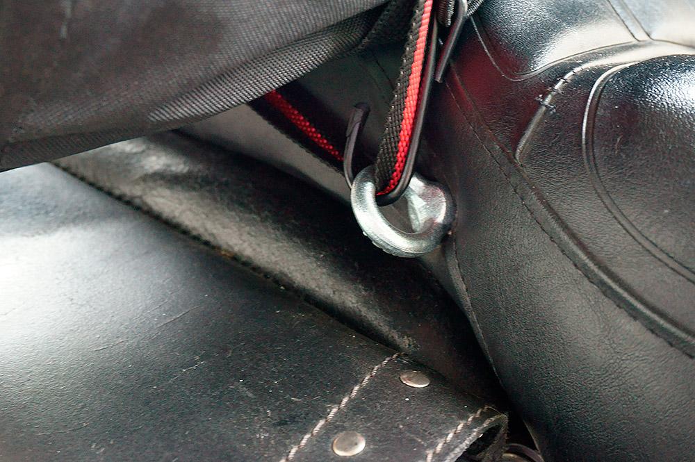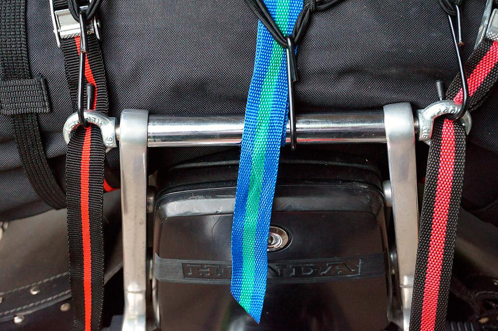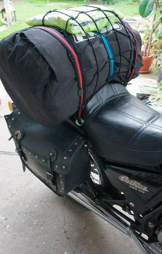 szerk: gumipókok örökre száműzve, 3 db olcsó csatos hevederrel oldottam meg a hengerzsák rögzítését a szemekhez, a tetejére meg egy 1500 forintos sisakhálóval kötöztem a saját nylon zsákjában lévő esőruhát. Onnan lehet a leghamarabb elővenni, ráadásul egy fél oldaltáskányi helyem is felszabadult. Masszív mint állat, a csomagnál fogva fel lehet borítani a motort!