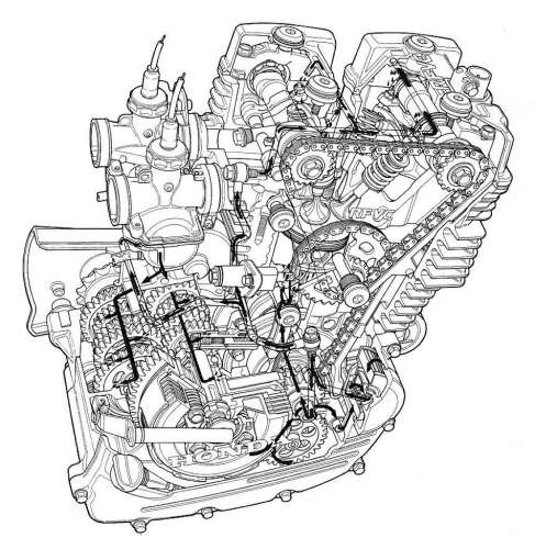 Nyolc biza (szelepenként kettő, egy keresztben, egy pedig hosszában elhelyezve)! A Honda 80-as évek eleji rettenete, az RFVC - blokk van benne. Ehhez képest már bakfitty az egyhengeres mociban alkalmazott 2 db vezérműlánc és a 2 db karburátor!