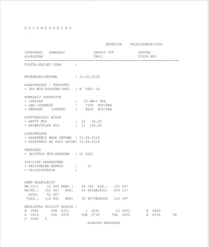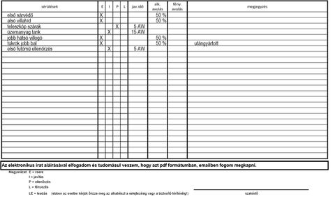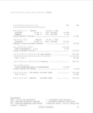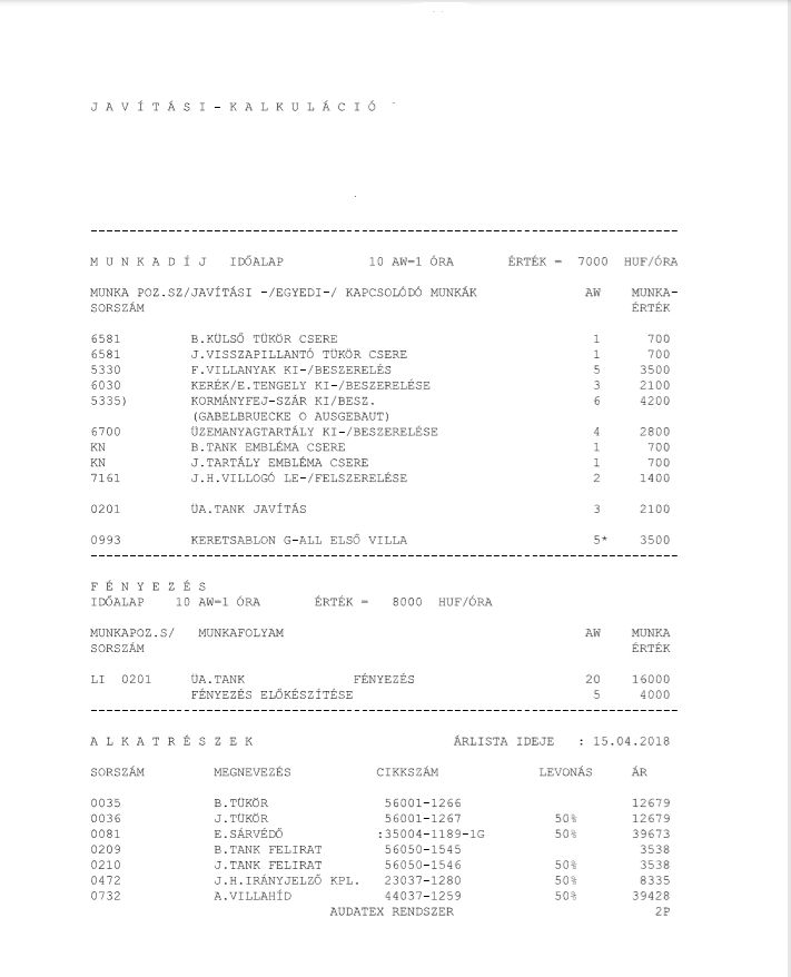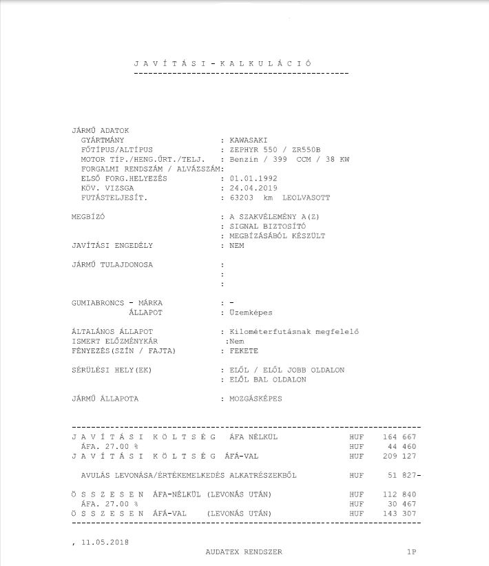 Mellékelten küldöm a javítási kalkulációt. Amennyiben a biztosító is jóváhagyja a kalkuláció nettó (ÁFA nélküli) összegére lehet egyezséget kötni. Számlás javítás előtt árajánlat szükséges. A javítást csak a biztosító által jóváhagyott árajánlat birtokában lehet megkezdeni.
