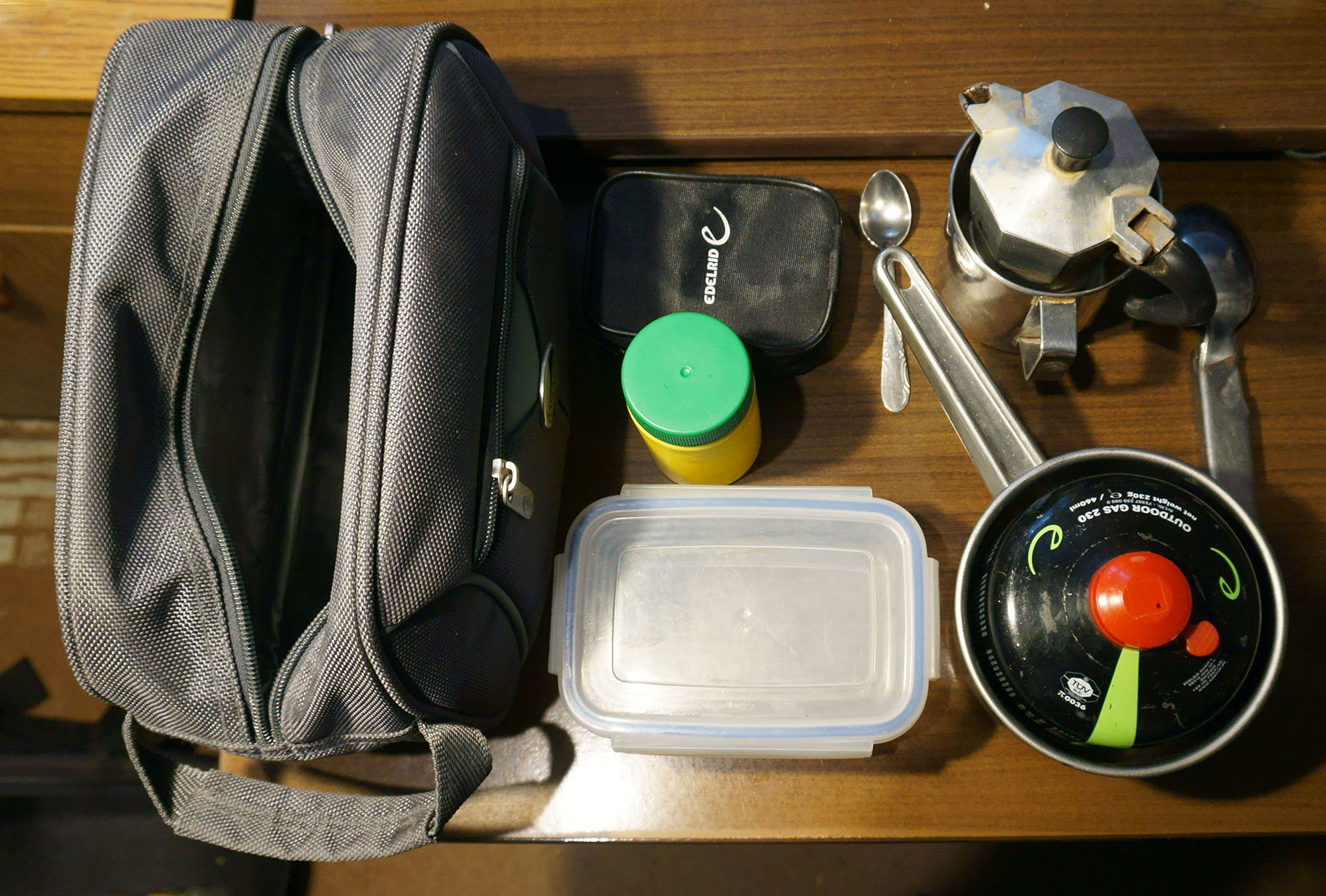 (#94991) emre: ha jól válogatod meg a cuccokat, akkor meglepően kis helyre elfér az egész. Igen, még egyszemélyes kotyogó kávéfőzőm is van, a főzőedénybe meg pont belefér a palack. Az egész egy kis neszesszerbe becsomagolható.