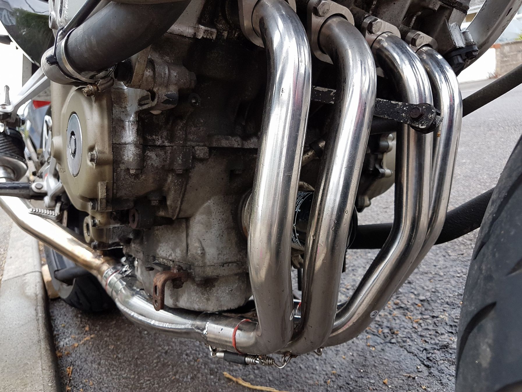 Meglátom majd később, h fellazul-e.A leömlőt Ebay-en vettem, Delkevic márka 200 fontért (itt kezdődik az új rozsdamentes leömlő ehhez a motorhoz), out-of-the-box nem illeszkedett, kipufogós hajlította rá a rögzítési pontokra.