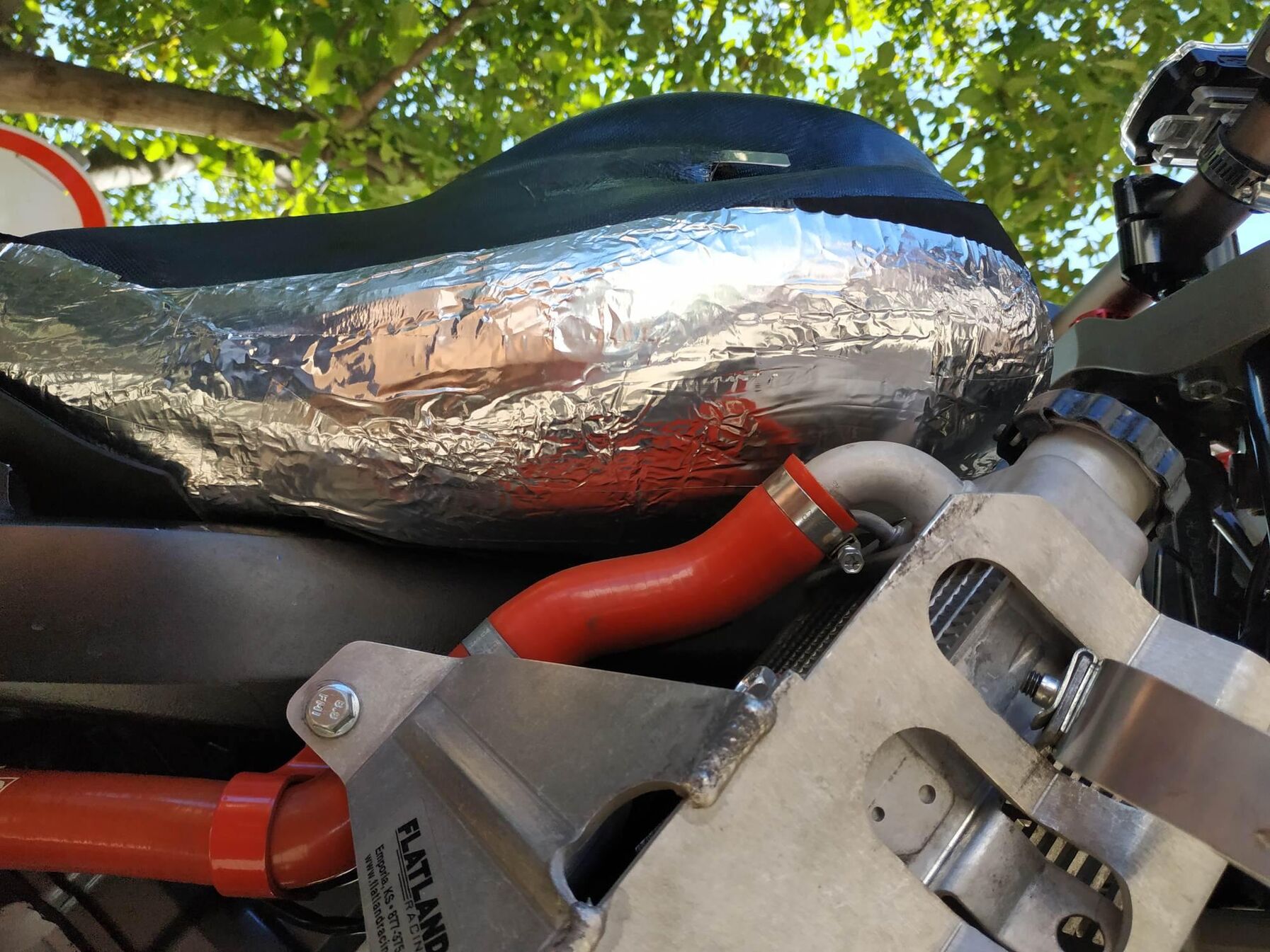 Egy pillanatnyi kihagyás erejéig ultrabalfasz voltam, elcsúsztam és a kavicsos felület összecseszte az egész jobb oldalát. Pedig nem volt egy nagy esés, műszakilag a kormány hajlott el enyhén meg letört az index. Esztétikailag meg GTK mert a váz és a hengerfej is összekarcolódott. A lábfejemet bevertem a kormányba ahogy repültem át, a csizma elején persze semmiféle védelem, az estére bedagadt majd kiderült hogy letört a tetejéről egy darab. Szerencsére hamar meggyógyult az.
