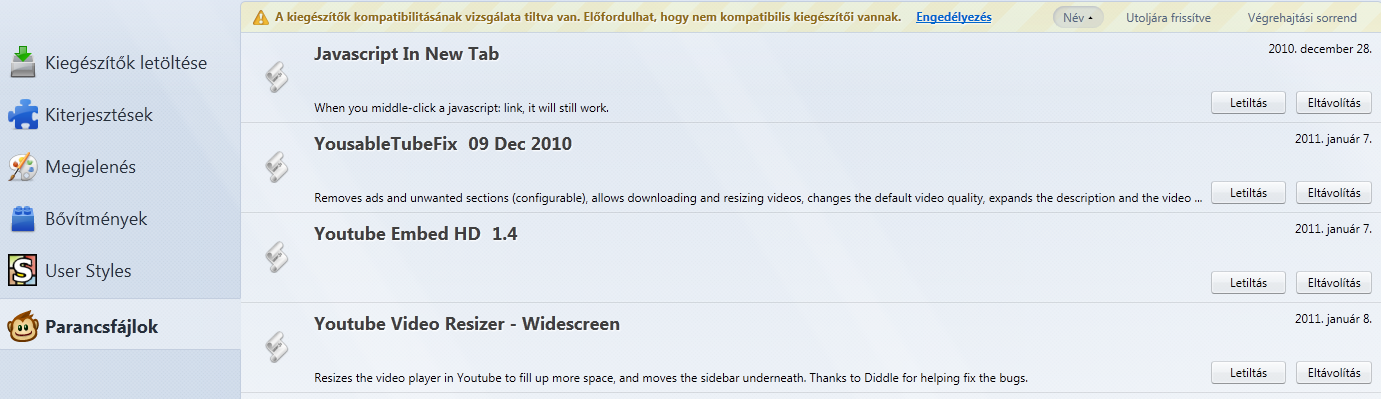 Igen, kilistázta őket, nagyrészt tényleg kiterjesztések dolgai voltak. De ez így talán logikus magyarázat lehet, hogy valami kiterjesztésnek ottmaradt valami szemete, és ezért lehetett, hogy hiába tiltottam le a kiegészítőket, a probléma jelentkezett, viszont csökkentett módban már nem (mert akkor tényleg semmit nem tölt be). Viszont volt többször is, hogy úgy tűnt, hogy megoldódott a gond, aztán kicsit később kiderült, hogy mégse... Majd így próbálgatom, aztán megírom, mi lett. Reméljük, így már jó lesz. Köszi a segítséget!