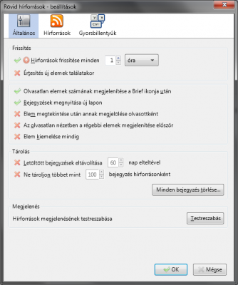 Brief-nél egy baj van, hogy csak az utolsó 30RSS-t tölti le (vagy amennyit a szerver meghatároz maximumnak), úgyhogy ha 5 órát vagy offline, és megjelenik 50 hír 1 oldalon, akkor 20 hír elveszik. Én spec olyan oldalakat raktam csak be, ahol naponta van kb egyenként 20 hír, így 1 órás intervallummal tökéletesen jó.