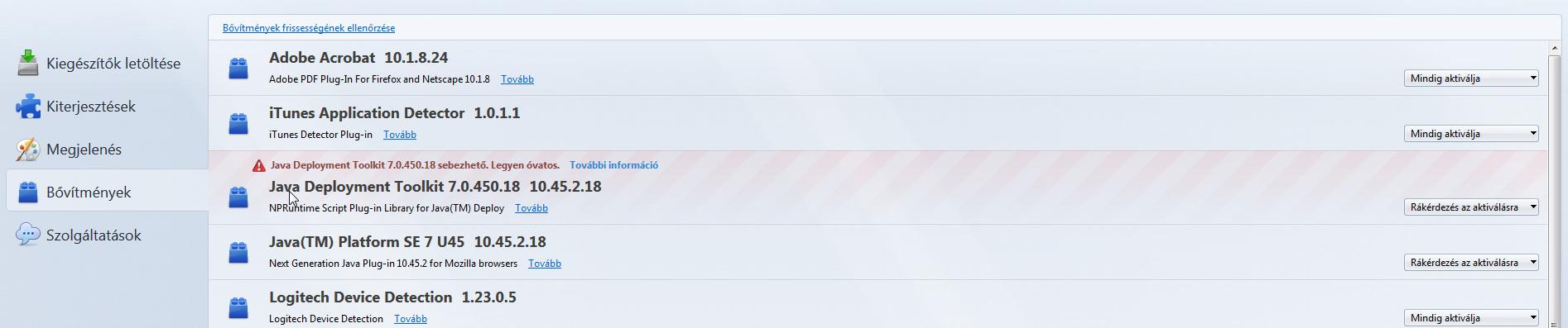 Nálam sem a flasht sem a Javat nem kezeli. Adobe flash 12. van fenn , de nem kezeli. A Javat automatikusan tiltja le , ahogy eddig is most viszont nem indítja ha kell, pedig ----rá kérdezés az aktiválásra---- van beállítva... Tegnap kezdődött ez.....