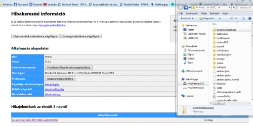 a bookmarkbackups mappába ha belenézel és van sok .json fájl, akkor nincs nagy gond, mert nagy valószínűséggel vissza tudod állítani a könyvjelzőidet. Ha vannak benne fájlok, ezt a mappát másold ki magadnak, mondjuk az Asztalra. a másik képen tapasztalt probléma miatt én csinálnék egy Firefox alaphelyzetbe állítását. a Hibakeresési lap jobb felén találod, ami épp takarva van. ezt követően ebből a mappából állítsd vissza a könyvjelzőkezelőben (ctrl+shift+b) a könyvjelzőidet. (a kimásolt mappára azért van szükség, mert nem tudom hogy alaphelyzetbe állításkor törli-e ezt a backup-ot vagy sem)