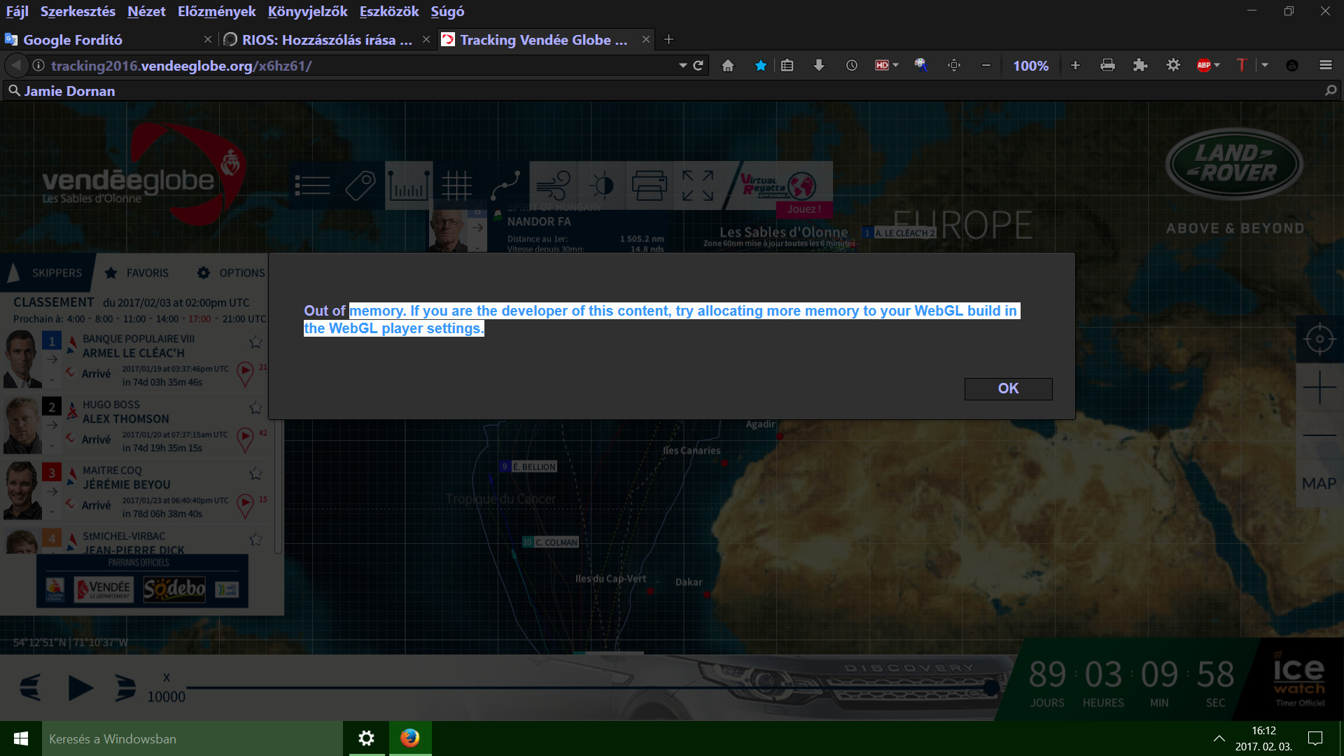 Követem Fa Nándor útját a Wendéeglobon [link] , de mostánában lefagy az oldal WebGL hiba miatt. Lehet állítani valamit, hogy több memóriát kapjon a WebGL