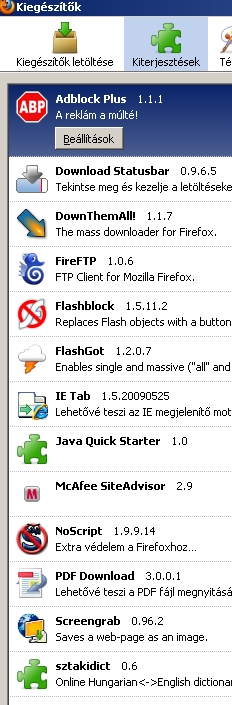 kiegészítők : flashblock, hun dictionary, remove cookies for site, Snap links, webmail notifier és a WOT.