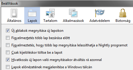 Ha valaki hasznalja ezt a beallitast browser.link.open_newwindow.restriction Eredeti ertek 2 atallitva 0 melynek ez a szerepe, mindig uj lapon nyiljanak a popup-ok is, a 20-as verzio ota atkell allitani hozza a browser.link.open_newwindow.override.external valtozot -1 -rol 1-re -