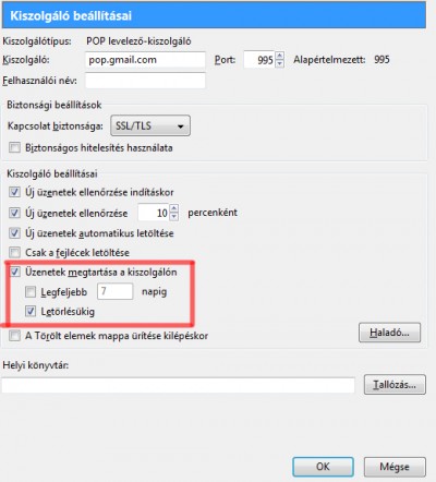 "POP levél letöltésekor erről a kiszolgálóról a következő mappa használata az új levelekhez"