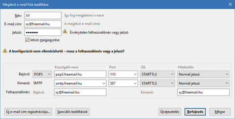 Tehát: felülre az e-mail címhez mehet a Freemail, és a hozzá tartozó jelszó. A bejövő rész jó, esetleg hitelesítésnél válaszd ki kézzel a normál jelszót. Kimenő részhez akkor mehet az smtp.freemail.hu, a port jó (587), SSL: STARTTLS.
