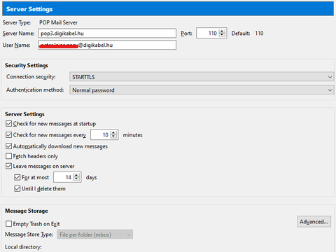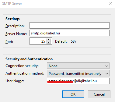 De ahogy az előbbi hsz-emben írtam, beírtam a felhasználó nevemet a Levélküldő (SMTP) kiszolgáló beállításaimnál: *****@digikabel.hu.