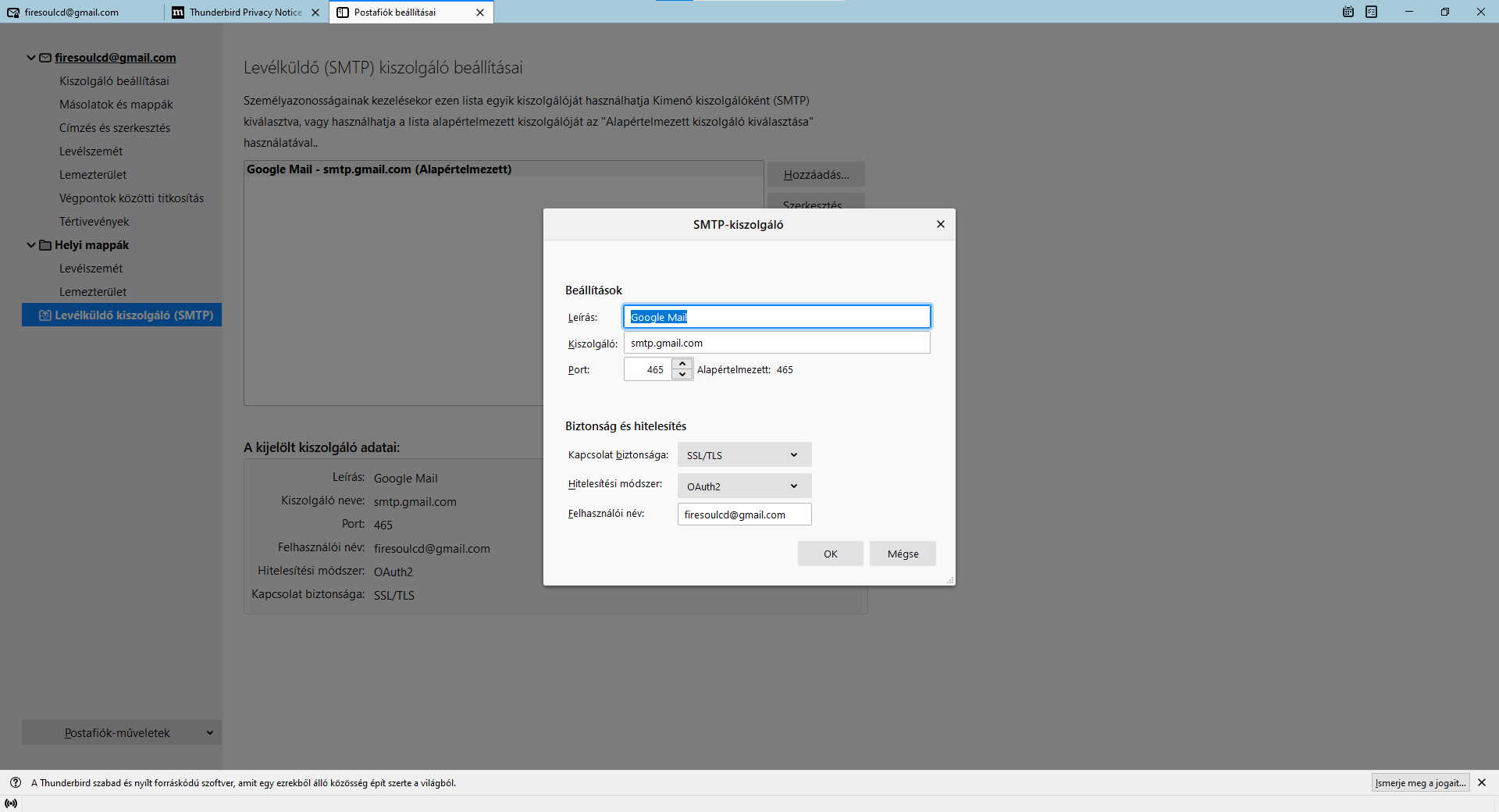 kiszolgáló: smtp.gmail.com
