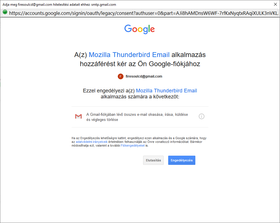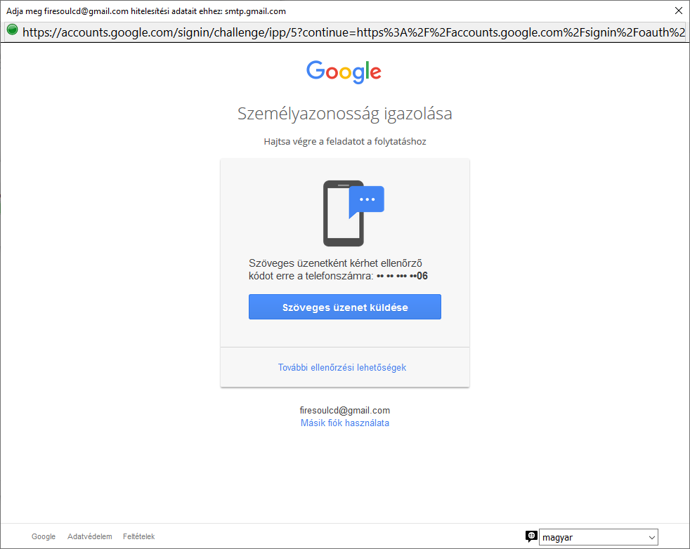 Mielőtt bárminek nekiállnál, a Gmail fiókhoz kell hogy legyen hozzárendelve egy másodlagos(biztonsági) email cím és/vagy telefonszám, mert először a gmail hitelesítést kér("Személyazonosság igazolása" címen) az SMTP kapcsán és a biztonsági kódot a megadott email vagy telószámra küldi ki, úgy lehet csak engedélyt adni a TB-nek (lejjebb minden világos lesz)!