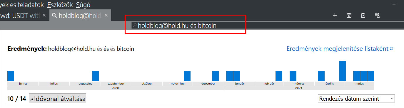 A Gyorsszűrő mellett lévő cellába (lásd a képet) a keresendő szavak közé "és" vagy "and" (angol TB esetén) szavakat kell beírni és a program megtalálja a keresett üzeneteket.Majd az Enter lenyomása után idősorrendben megjelennek azok az üzenetek, amelyek az általunk beírt feltételeknek megfelelnek: