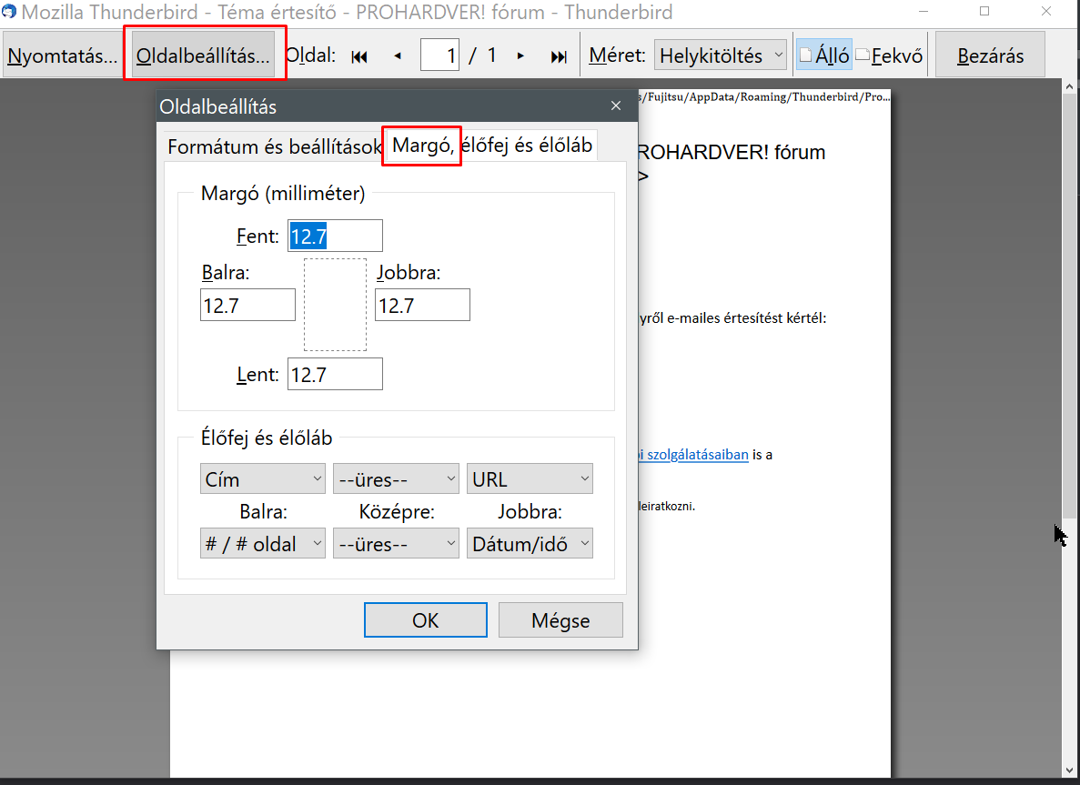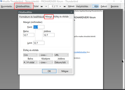 Kiválasztod a levelet, amit ki akarsz nyomtatni, majd Fájl > Nyomtatási kép > Oldalbeállítás > Margó, élőfej és élőláb ott találod!