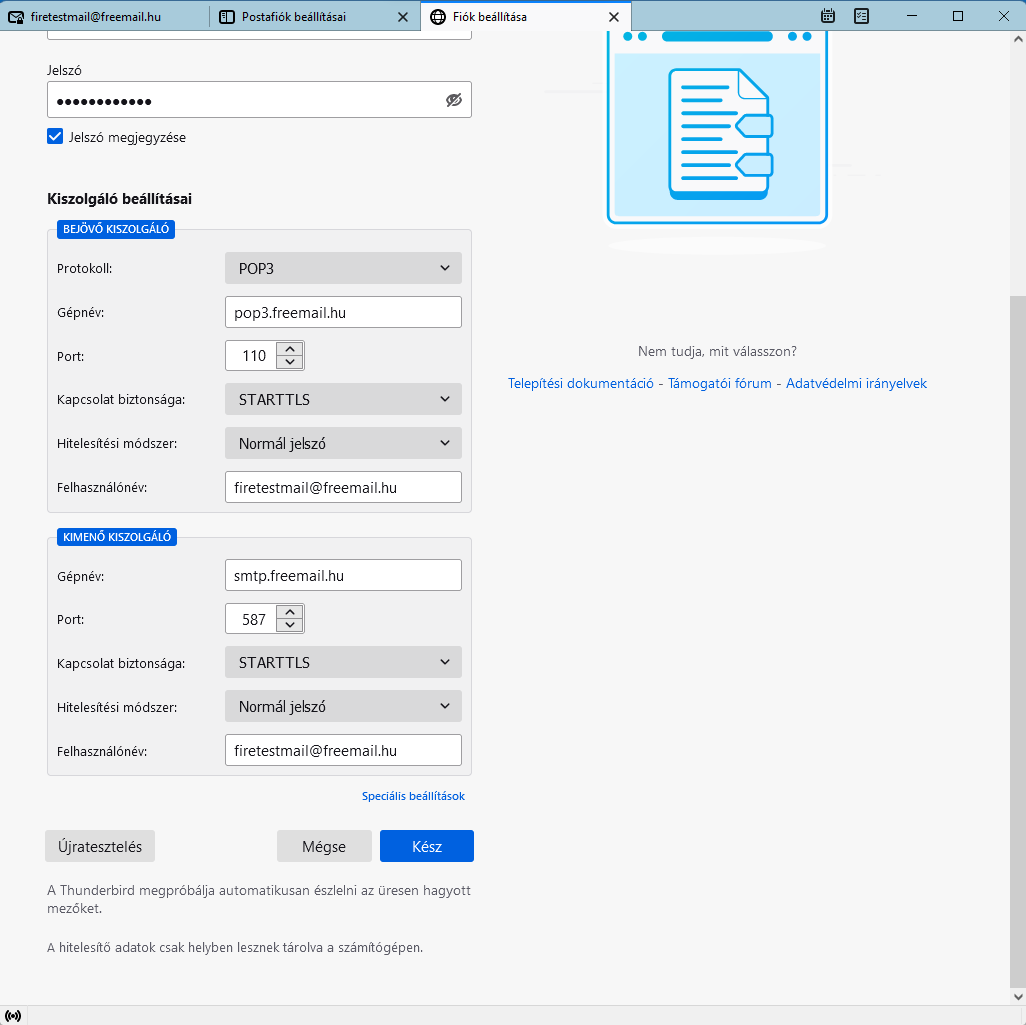 Most direkt létrehoztam egy Freemail fiókot és simán hozzá tudtam adni a TB-re bízva, automatikusan, kézi beállítás nélkül, fogadás és küldés is működik.