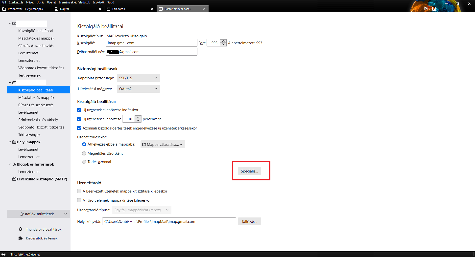 - "Remove duplicate messages": ez azért kell, mert bizonyos üzenetszűrők áthelynek beérkezett üzeneteket, de van úgy, hogy az adott e-mail duplikálódik (nem tudom miért)