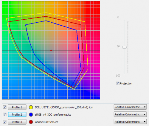 Tegnapi mérés kalibrálás után, a kék vonal az sRGB, a piros az adobe RGB, na a sárga az én Dell-em natív gamutja 5500K-n