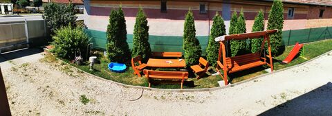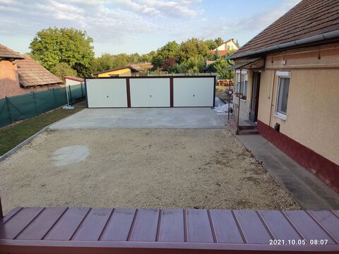 Az udvar murvás, van egy betonlap és egy tripla mobilgarázs. A murvát glialkázom nyaranta kb havonta, pont ma reggel. A kerítés mentén fűsáv, most ott a kerti pad és asztal. Szegélykő van, akár térkövezni is lehetne, de erre milliókat elkölteni sajnálnék, előbb a házat kéne szigetelni és újrapucolni.