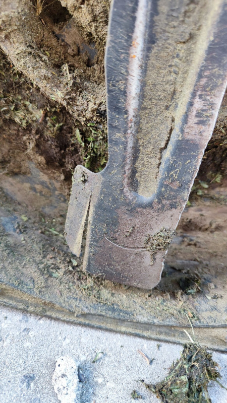 Én arra tippelek, hogy felkapott egy követ és az beakadt a fülbe. A kés alján nem látszik friss súrlódás nyom, inkább a közepe felé. Vagy a kiegyensúlyozás miatti rezgés is okozhat ilyet