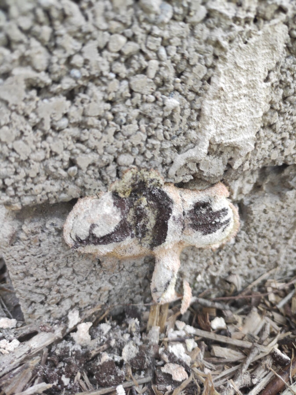 Ez mi lehet? Valami gomba? Kívülről rózsaszín, belül fehér, még beljebb sötétbarna, mint a kávézacc. Az ágdarálékból indult felfelé.