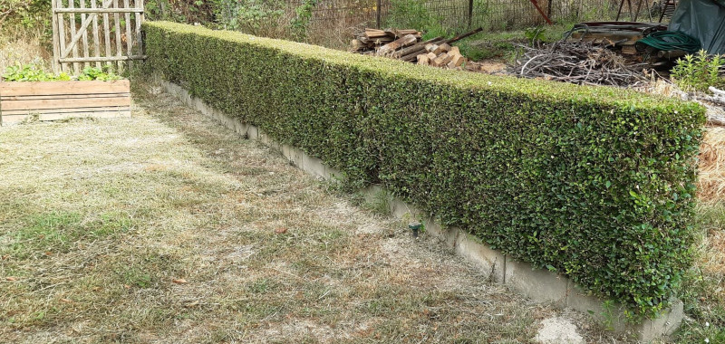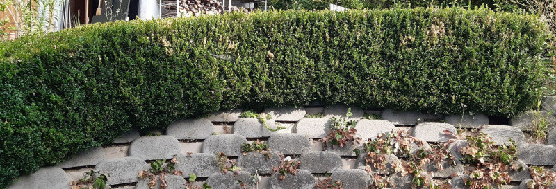 Bukszus, sokkal szebb volt, küzdök a molyokkal. Alacsonyabbra kellett vágnom, a sövényvágó nem viszi, metszőollóval kellett csinálnom. Gondolkozom a cserén.