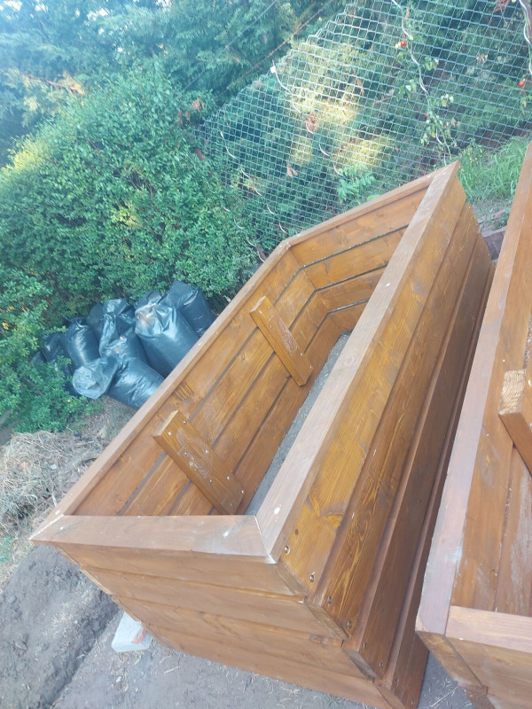 2x1m és kb 70cm magasak, 15x5 cm fenyő pallóból csináltam, gyalultam, csiszoltam és vékonylazúrral kezeltem, az összeszereléhez szerkezetépítő csavarokat használtam.