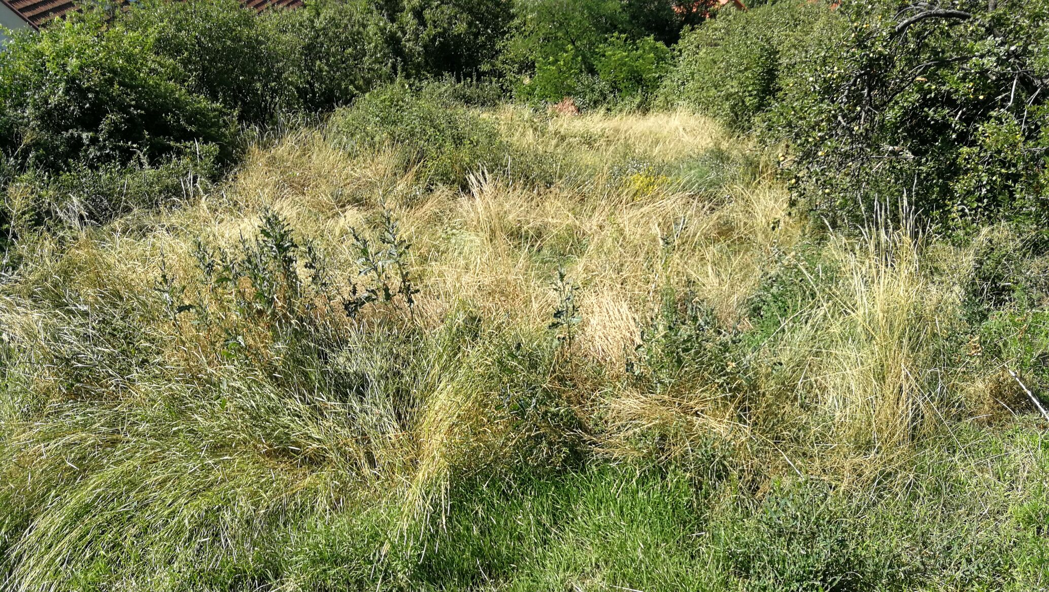 Ja nálunk is már inkább ilyen füves jellegű. Nem is tudom, talán 5 éve lehet parlagon. Évi néhányszor vágom, de sokszor hagyom megnőni. Egyedül a parlagfű, amit képtelenség kiirtani a kavicsos részről. Főleg ilyenkor ha nyáron visszavágom a szárazságban a füvet, akkor kezd el hajtani.