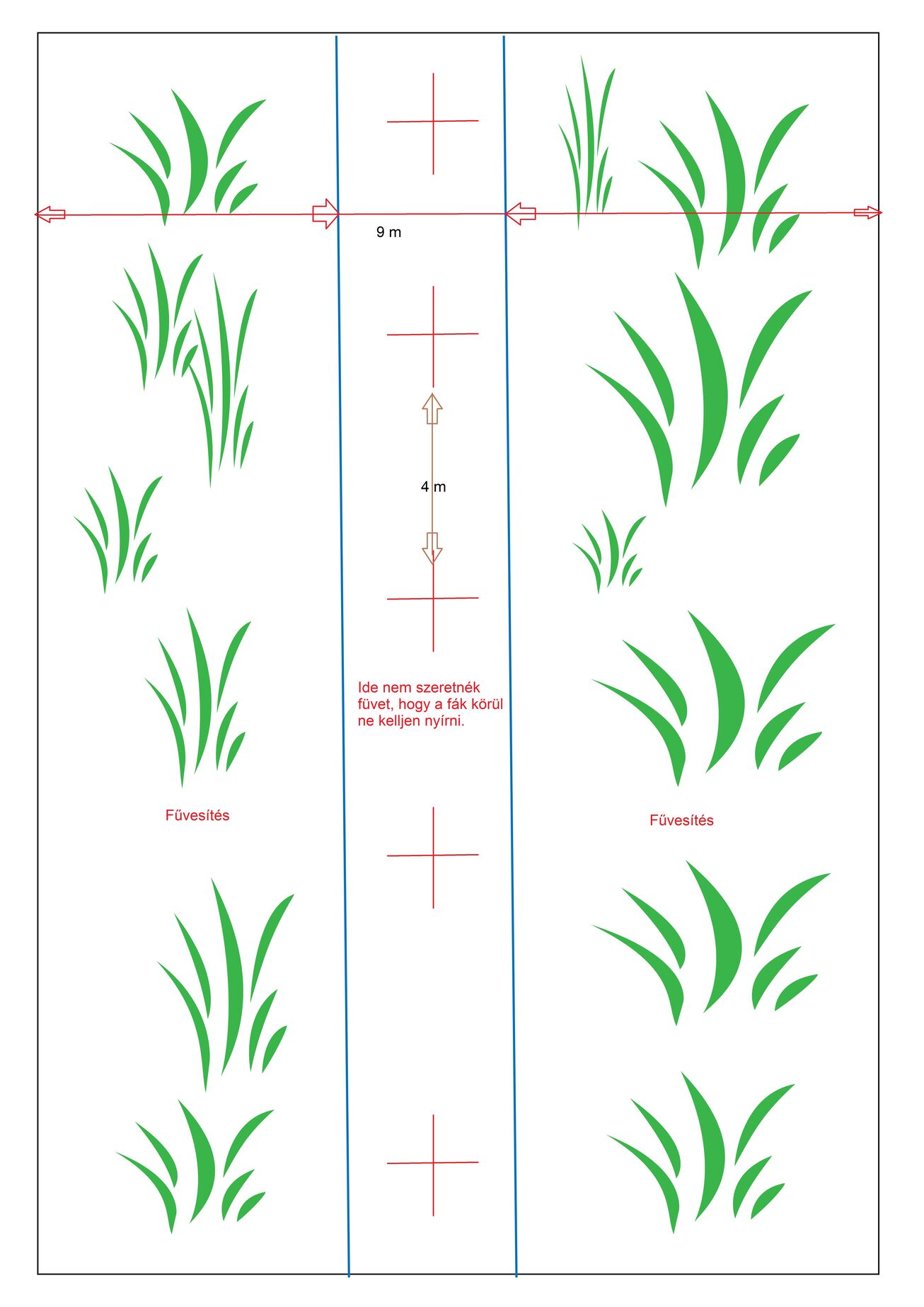 Maga a terület 9m széles ( feketével jelölve a terület ) . A fák a területen középre vannak téve, mivel be van kerítve, és ne lógjon semerre se ki, és könyebb legyen rajta a közlekedés( mert jó hosszú, gyalog később már bajos lenne ) . Ugye be szeretném füvesíteni, viszont én úgy gondoltam, hogy maga ahol a fák vannak középen ( tehát a kékkel jelölt , ott vannak a fák) ott nem füvesíteném be, tehát egy sávon ( lényegében középen a fák körül ) nem lenne füvesítés, hogy ne kelljen ott bohockodni a fák alatt. A fáktól olyan 1-1,5 m szélességet hagynék el és úgy füvesíteném be. Viszont, mivel ugye oda nem kerül fű, így gondolom fel fog jönni ott a gyom, ott mivel ápoljam? Használhatok minimális gyomírtót, ami még nem jut a le a gyökérbe, vagy esetleg rakjak le geotextilt? Ki, hogy csinálná?Köszönöm.