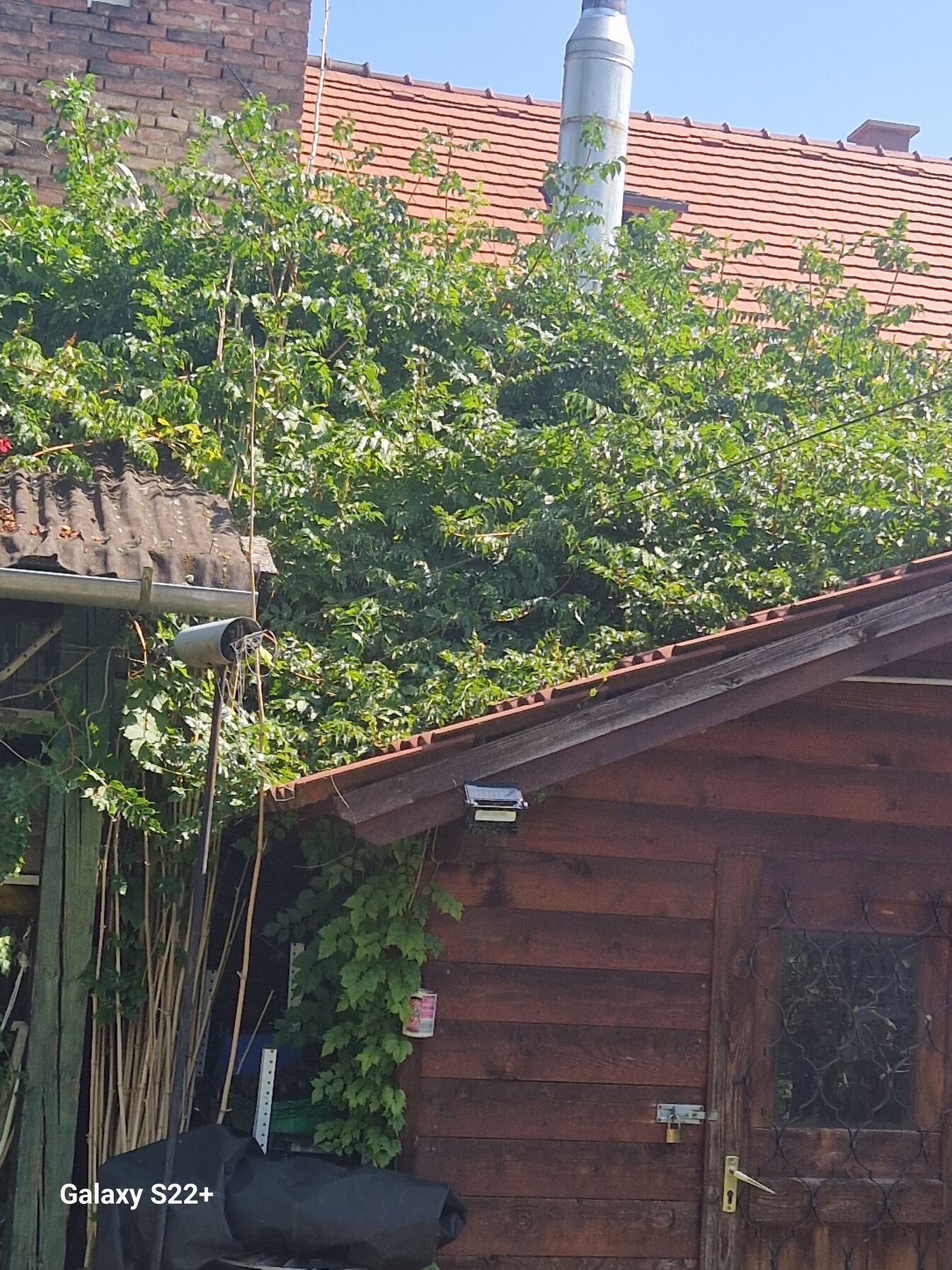 Nem vagyok a vegyszerek híve, de valamit kénytelen leszek hasznélni. Megjelent nálunk ma délelőtt a hátsó szomszéd, és szépen kérte, hogy a kert végében növő Vadászkürttel kezdjünk valami. Ugyanis az ő oldalán lévő kis ház cserepeit kezdi emelgetni. Tavaly tavasszal a tető síkjáig vissza lett vágva, de azt gyorsan visszanőtte. Én meg egyre inkább nem vagyok abban az állapotban, hogy a létra tetején nyújtózkodva egy hosszú nyelű ollóval évente akár 2x is nyesegessen ezt az átkot. Jelen pillanatban így néz ki a helyzet