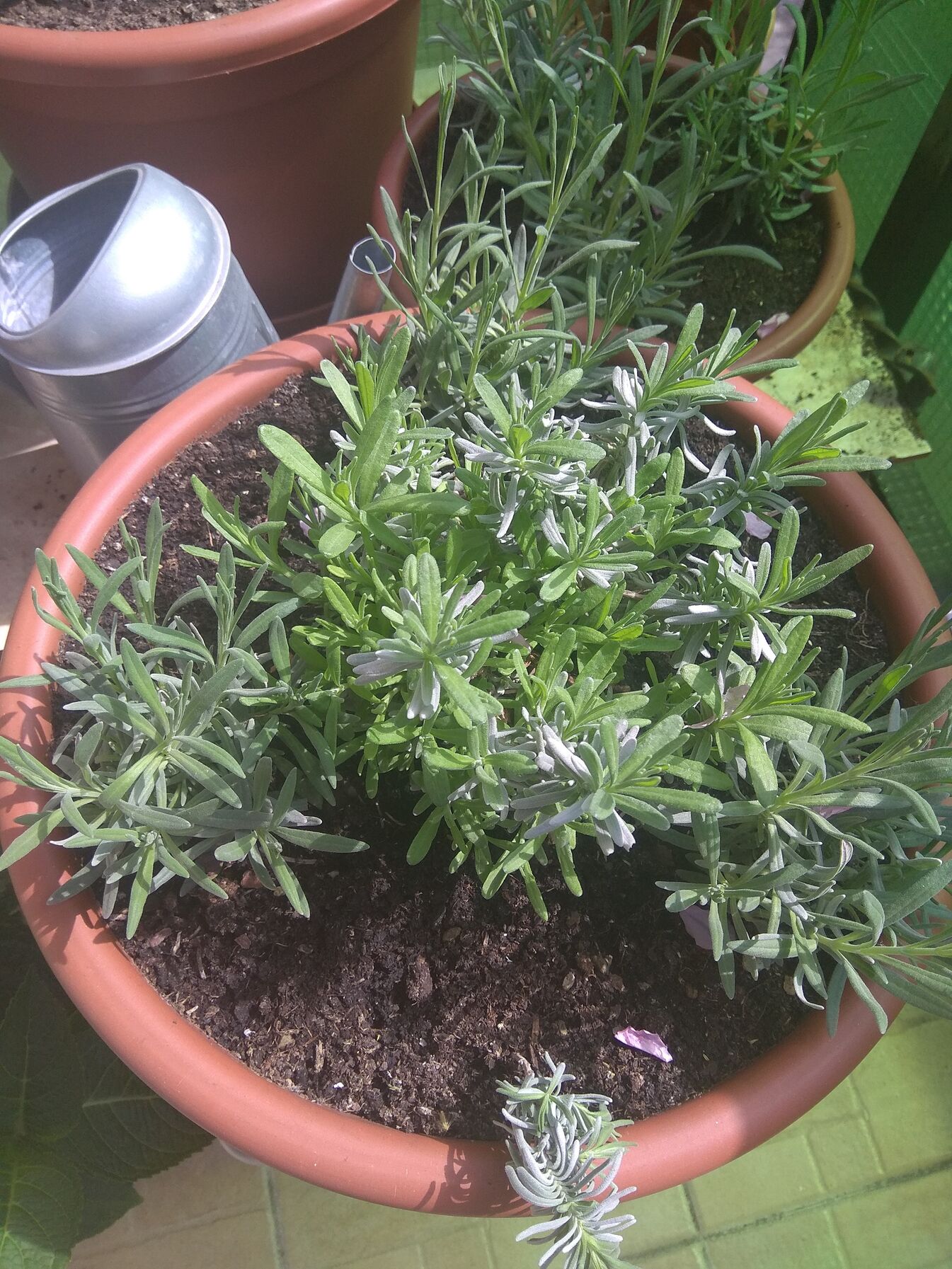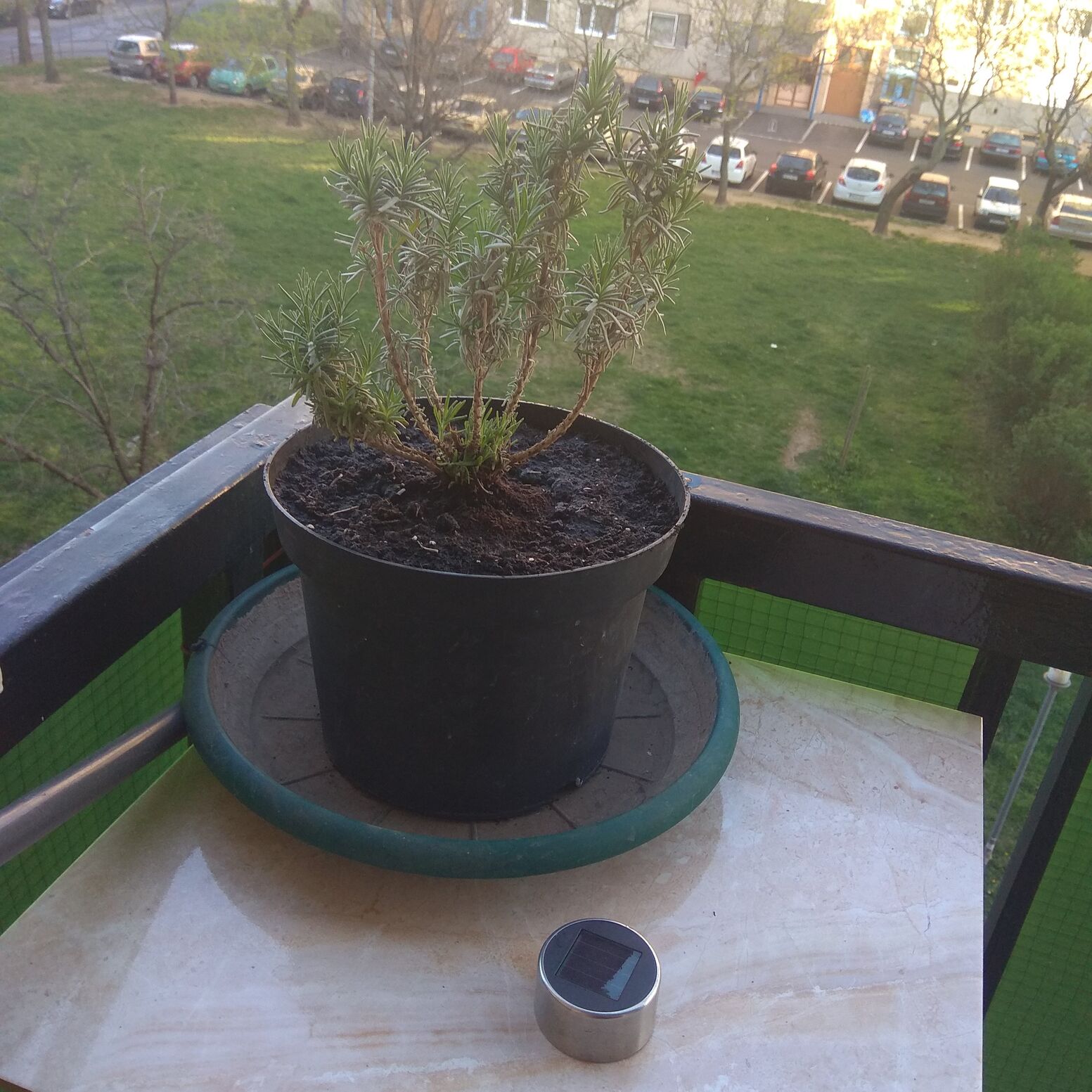 ezen a képen pedig látszik hátul a vihar sarok, jelenleg oda gyűjtjük a kiszedett gyomokat - mivel én elmentem senkinek nem sikerült zöldhulladékos zsákot venni, a kukába meg nem fér ( : -, oda menne jövőre levendula - egyébként érdekes, sok rovart kifejezetten taszít, pl a tetveket is, de a káposzta lepke simán rátojja a petéit, és a lárvája megeszi a levendulát , és nagyon durván bele tud olvadni a színe a növénybe -, és látszanak a borostyánok is ahogy éledeznek, sarokban a sötét zöld az ős-borostyán ( : már fenn van a 4. emeleten, és kb a minusz másodikról indul, a hátsó babérsom mögöttvan a fehér szélű, kékes belsejű verzió, mellette a világos zöld betétes verzió, ha ők megnőnek sztem igen szép látvány lesz a babérsommal eőtérben, a sötét zöldből is vezetek oda indákatszerk: