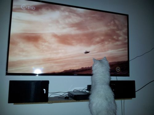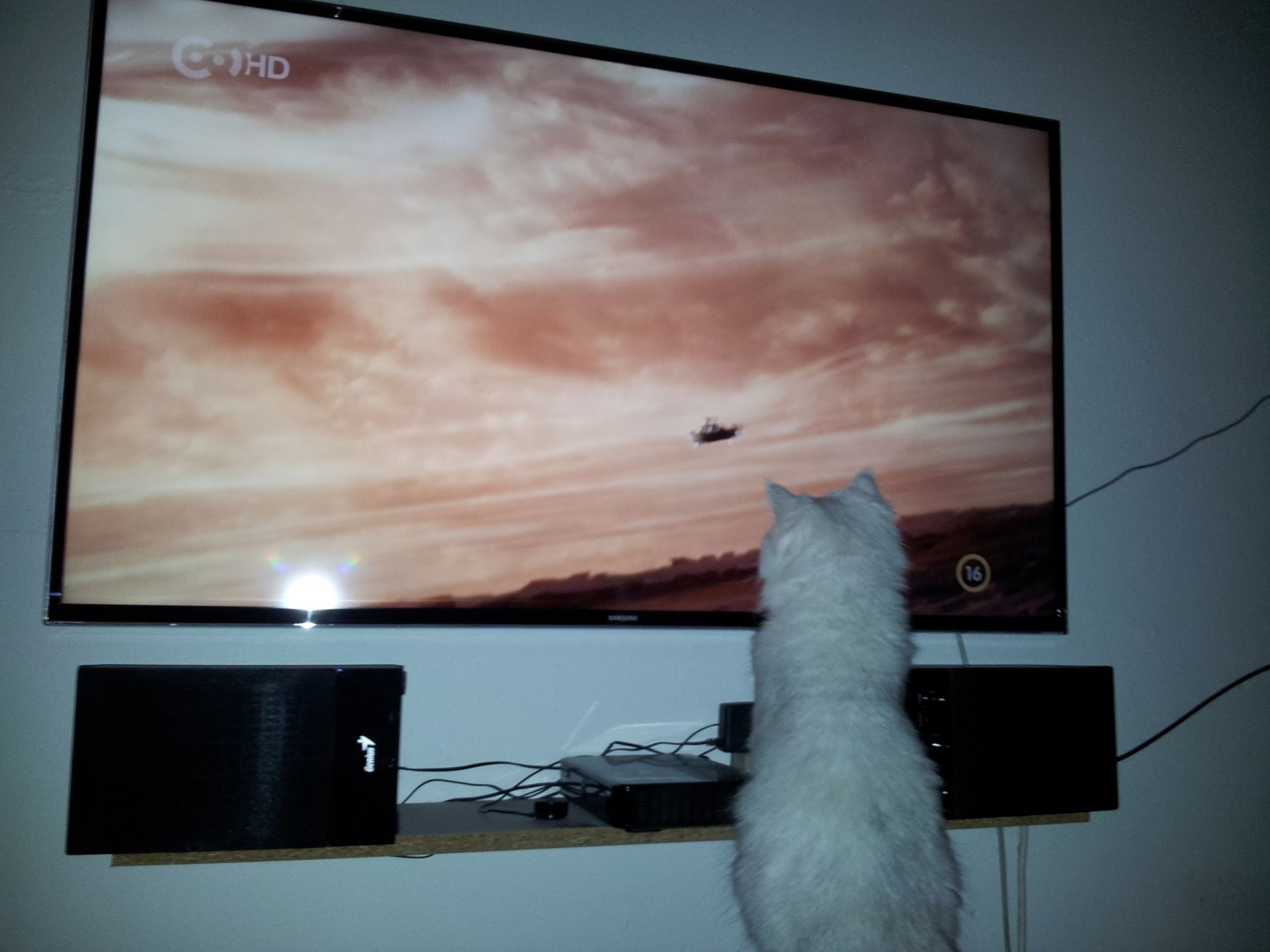 Tegnap délután néztem pár macskás videót youtube-on és most először ő is felmászott a tv-hez és megnézte, a hangszóróval le is borult, oké macska volt a képen meg nyávogtak is