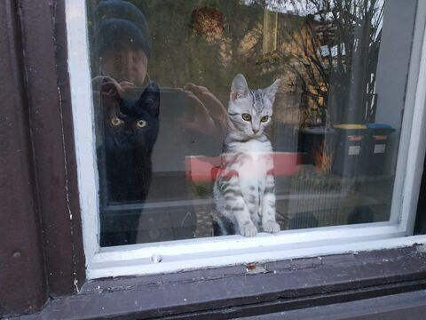 Múltkor találkoztunk egy pórázon sétáló cicával, meglátta, boldogan odarohant, és a szokásos "gyere játszani" pózban ("két mellső előre kinyújtva, fej rajtuk, feneke meg az égben"