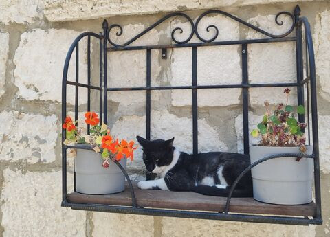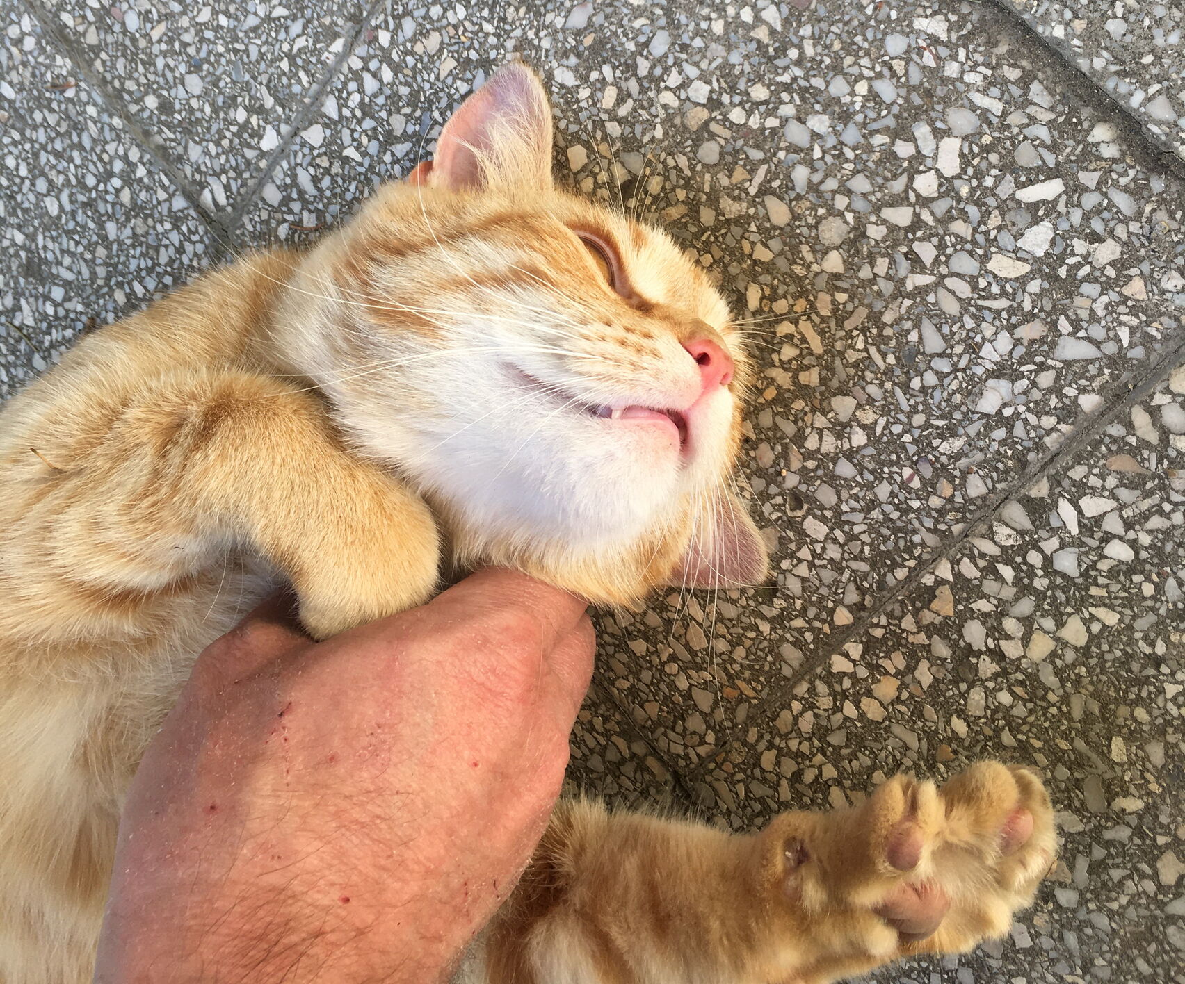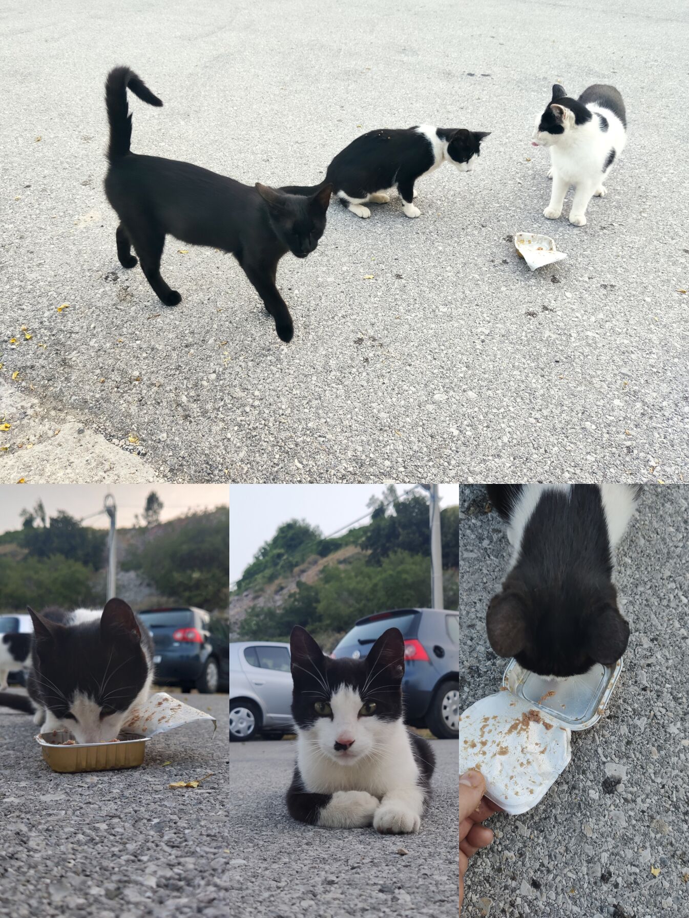 Mi is segítettünk a macskáknak, de csak kicsit meglazítottuk. Mindig egy nagyobb falatot vettek ki azt tömték be gyorsan. Szegények éhesek, de most pár napig lesz elég élelem a gyomrukban. Mivel itt több kiadó apartman is van, remélem akik jönnek a nyáron ellátják a macskuszokat.