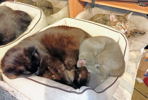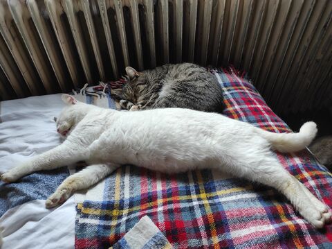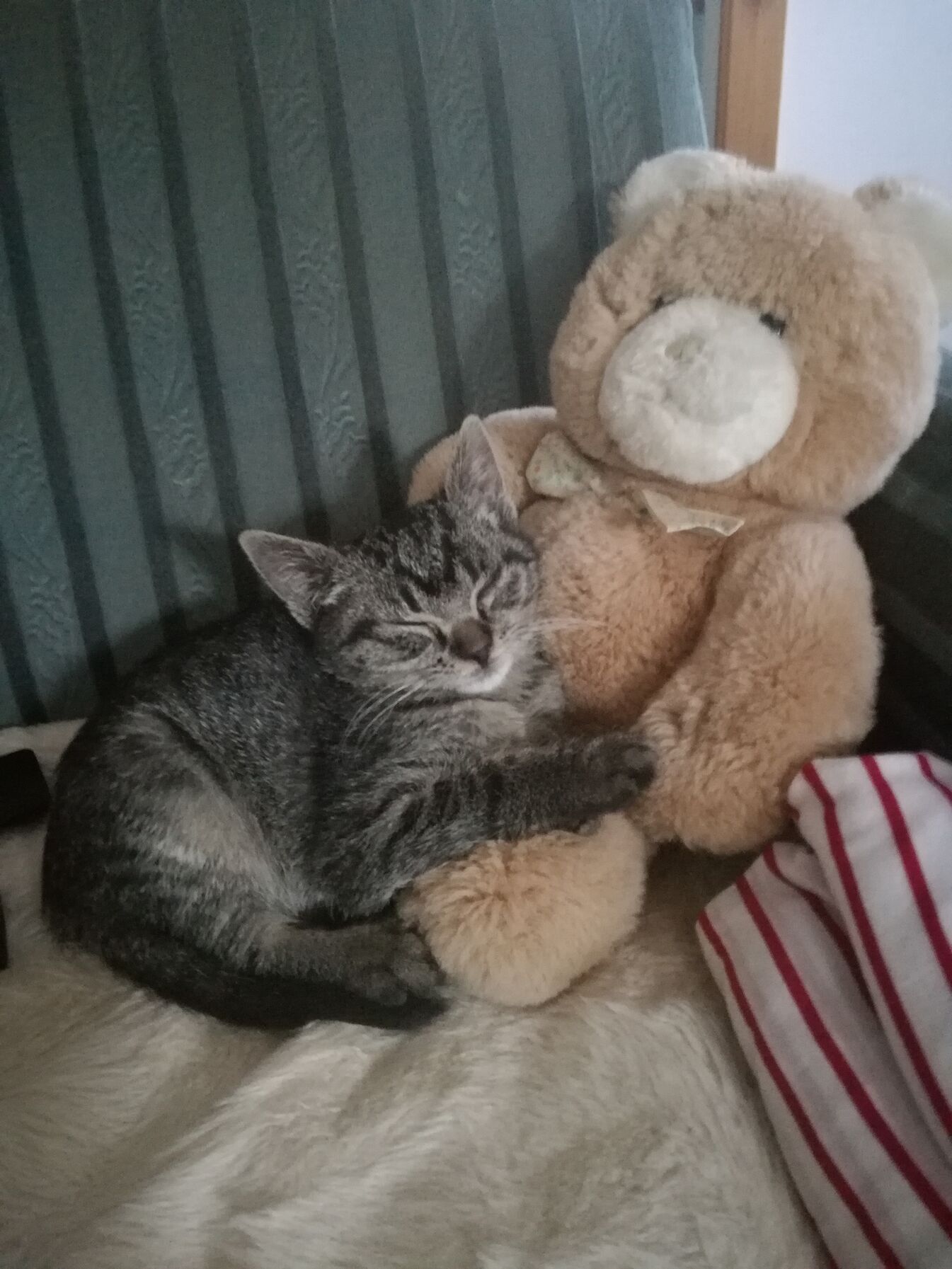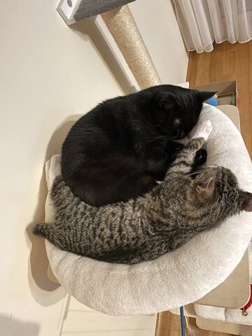 Amikor szerdán előhoztuk a kicsi hordozóját, a nagy rögtön belement, nyávogott, nem akarta elengedni. Amikor hazaértünk kb. 2 órával később, a nagy (aki rendszerint fekszik a helyén, és legjobb esetben egy "na mi van konzervnyitó, megjöttél?" tekintetet kapunk) ott ült az ajtóban, teljesen meg volt kergülve, hogy nyissuk ki a hordozót, majd elkezdte mosdatni a kicsit, ment az összeborulós dorombolás, basszus, egymásnak örült a két macska, egymásnak doromboltak. Azóta együtt alszanak, sőt, hajnalban együtt jönnek a hálóba és fekszenek be a feleségem és közém. Mi meg olvadunk el, szinte megkönnyezzük, hogy ennek a kis szarosnak milyen jó élete lett, és Tappancs is milyen barátot kapott.