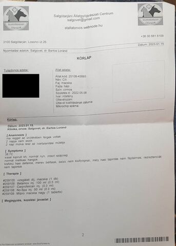 Tegnap az ügyeletes doki ezt a kórlapot adta, a cica kapott három injekciót is, mivel enyhe bélgyulladást állapított meg nála, és szerinte lehet, hogy a férgeken kívül baktériumok is okozhatják. Kapott féregtelenítőt, egyelőre fél tablettát, két hét múlva kell beadni neki a másik felét. Ma fog kiderülni, mi lesz a műtéttel, az állatorvosunk a kórlap alapján majd eldönti, hogy holnap meg lehet-e őt műteni, vagy inkább várjuk egy kicsit, amíg felépül ebből.