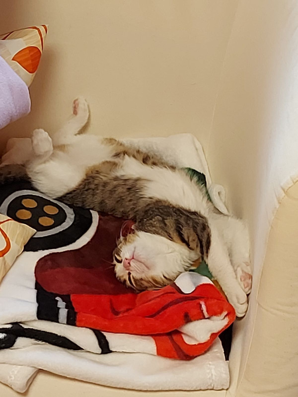 A kislány macskám még mindig nem engedi a spontán simogatást, de egyre közelebb alszik hozzám.
