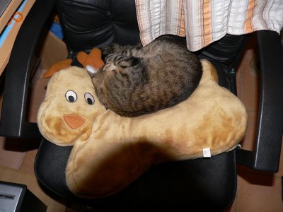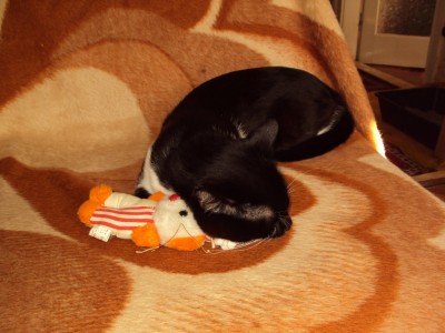 Van egy tappancsos fekhelye is, az nekem borzasztóan tetszik. Pici korában abban hoztam Pestre, kapásból abbaraktam bele, de azóta se ment bele egy percre se, soha, nem szereti. Nem tudom hogy lehetne rávenni, hogy belefeküdjön?