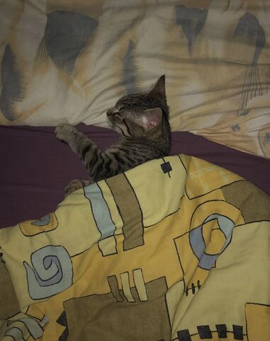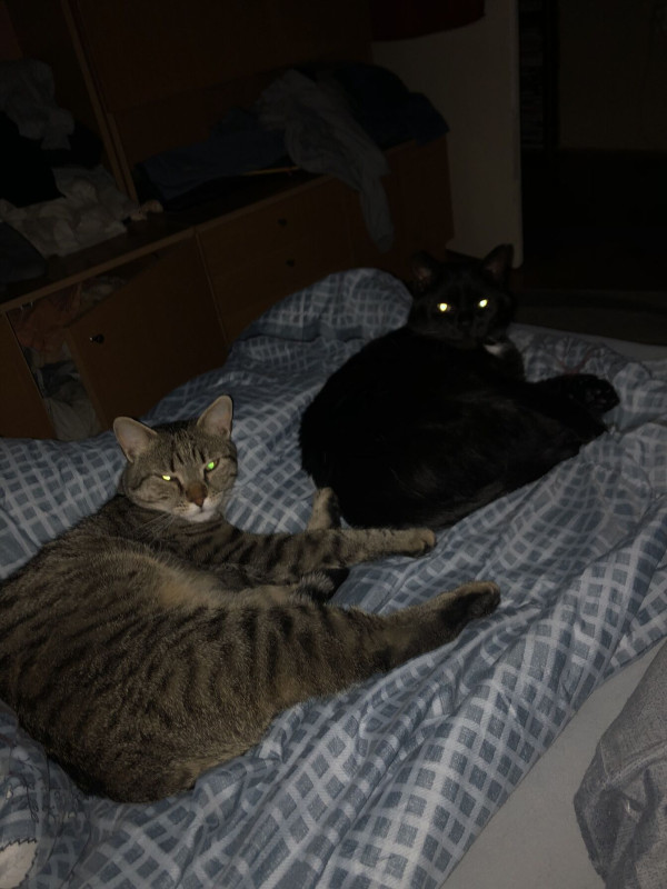 Ezt a barátnőm fotózta hajnali fél 5-kor. A macskák mögötti keskeny sávban alszom éppen. Ezek képesek apránként, kitartóan egyre nagyobb helyet bitorolni az én káromra.