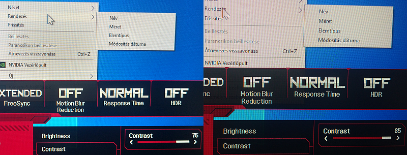 Nem gondolnám, hogy ez normális. Azért is zavar, mert a kontraszt növelésével a világos elemek fényereje is növekszik. Kontraszt 75-nél viszont látványosan elmarad a monitor fényereje a saját maximális értékétől, miközben elméletben tud nagyjából 300cd/m2-t, hasonlóan mint az előző TN paneles monitorom. Most így, ebben a felhős időben is éppen csak megfelelőnek mondom a fényerőt 100% brightness mellett.