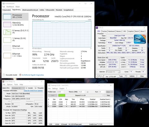 Mókás proci az a 930-as (itt van a fiókban). Sok 920-930 tudta a gyári órajelet akár kicsivel 1V alatt is, de az enyém alacsonyabb feszültségen el sem indult, cserébe ezen a feszültségen tuningolni is lehetett. A 4 GHz-et 1.28-on hozta, de gyenge volt a hűtő rajta, hogy magasabb órajellel próbálkozzak.