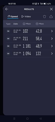 Munkahelyen tegnap és tegnapelőtt 5-8Mbps letöltés volt, ma már javult a helyzet, 30-70Mbps volt. Itthon is javult a helyzet, sőt éjjel megébredtem és ránéztem a telefonra és beltéren ott virított az 5G. Mértem egyet, 211Mbps volt. Reggel ismét csak a 4G volt. Kilépve az utcára a ház előtt, már ismét 5G volt. Mivel időre mentem, nem méricskéltem. Most megint van itthon 5G beltérben. Igaz semmivel sem jobb mint a 4G de már van, remélem ez valaminek a kezdete, és fog ez állandósulni, javulni, így áttérhetek az Othonnet Pro csomagra.