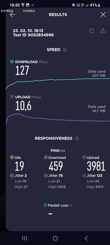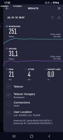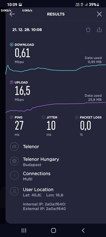 Zalaegerszegen egy árva N1-es vagy N78-as cella sem sikeredett, pedig a bázisok 90%-a már modernizált.... Persze már így is jobb a helyzet, mint a B20 only hálózattal, de hiába van 5 LTE sáv "csak" 3CA elérhető. Általában B3+B1+B8 a felállás, ami 40Mhz sávszélesség. Ha már nincs 5G legalább a B7-et bekapcsolhatták volna egy 4CA hálózattal....