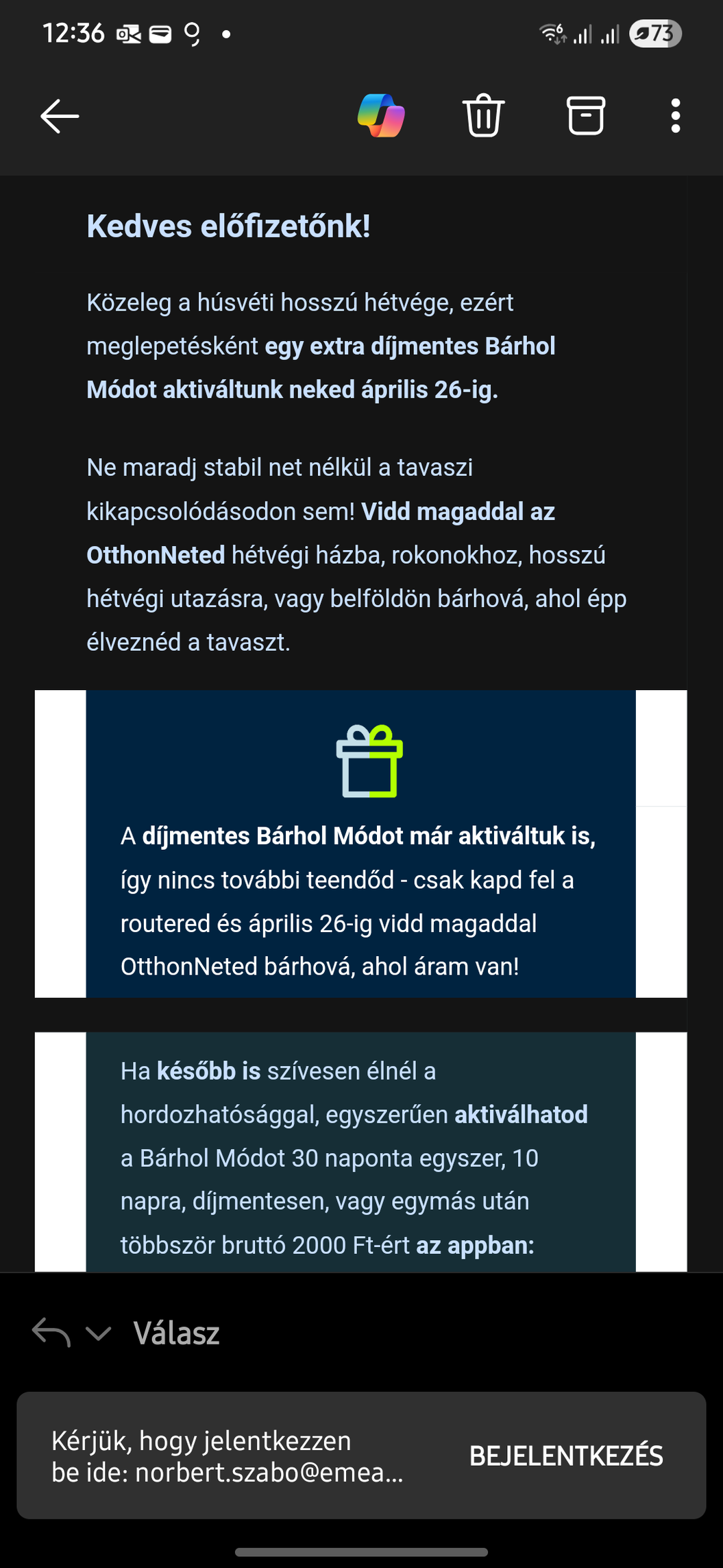 Nekem 6990 (mióta lejárt a hűség 7490Ft amiből az inflációs kedvezmény nem jön le, ellenben a 30% full kedvezmény igen, így, 5243Ft a havi fizetendő. Ez az egyik othonnet. Másik 9990 - 30% azaz 6993Ft a fizetendő. A 2 othonnet full ugyanaz ZTE MCA801 routerrel, a különbség csupán 260km. Ennyit jelent a helyszín.