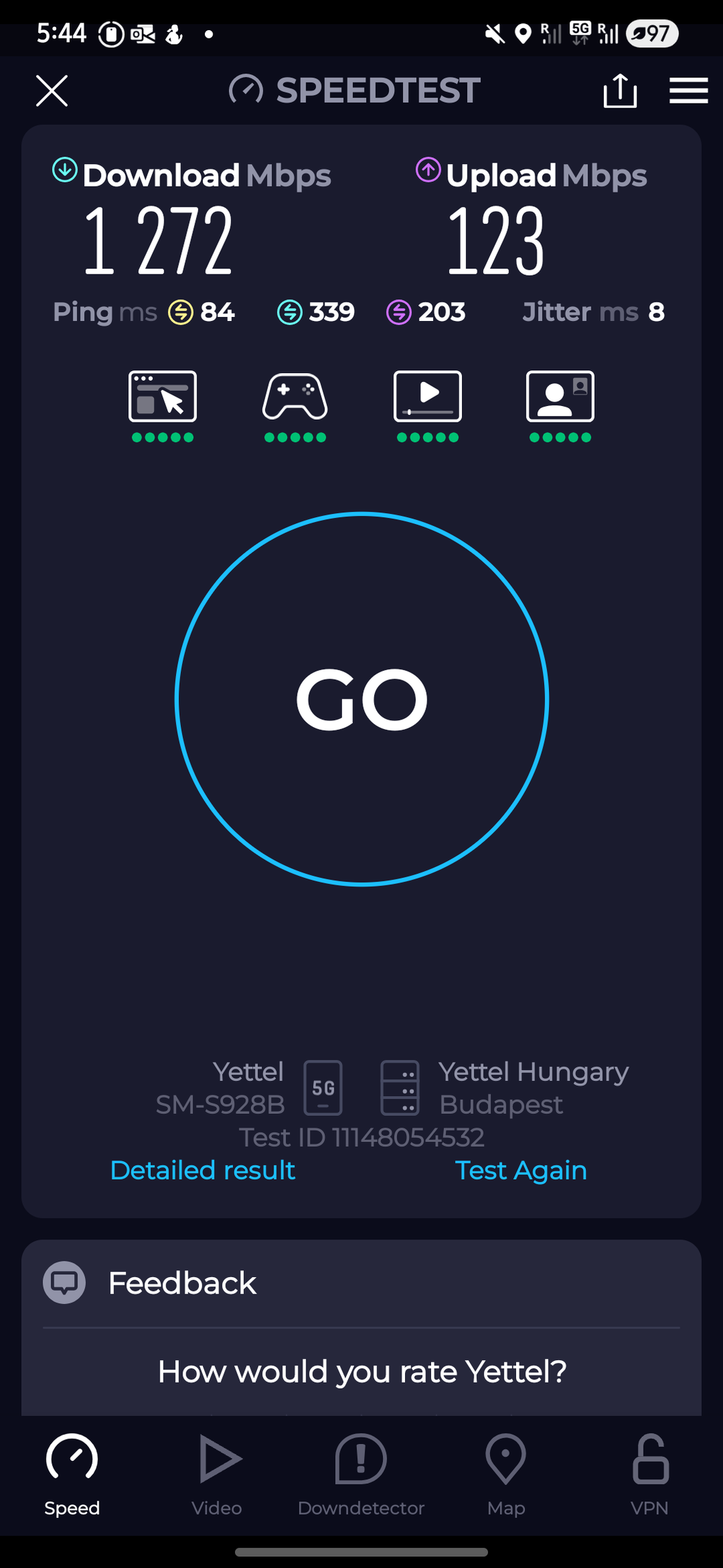 Yettellel 1237mbps volt a legtöbb amit mértem.Azt viszont vedd figyelembe hogy One csak egy szűk réteget enged fel 5G re, nem DSS 5G-je meg kb a lefedettség 1%-a. Addig Yettel mindenkit felenged 5G re, sokkal nagyobb a terheltsége.