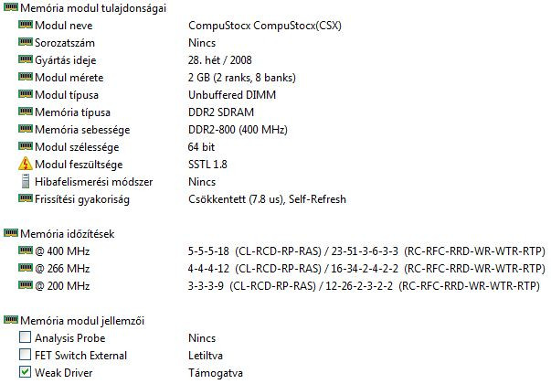 Gépemben jelenleg egy darab 2GB-os, 800 MHz-es CSX memória teljesít szolgálatot, szeretnék a másik slotba egy ugyanilyet vásárolni. Azt nem tudtam kideríteni, hogy az időzítése CL5 vagy CL6. Aida64 a következőket írja: