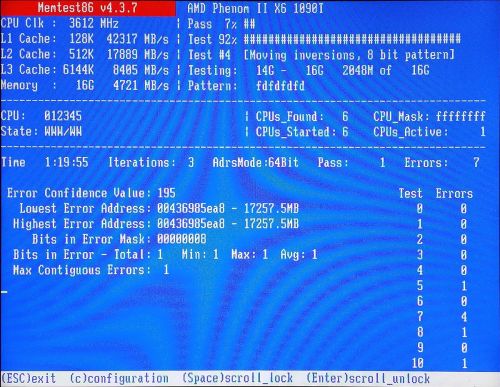mostanában elég sokat fagy a gépem, nem kell, hogy terhelt legyen elég egy böngésző is és kékhalál.Vagy a "memory management" vagy a "pfn list corrupt" a gondja. Új hardver nem került a gépbe, újra telepítve is volt már. 4 db 4GB memória van a gépemben. Lefuttattam egy memtest-et és ez lett az eredmény: